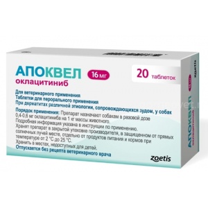 Апоквел 16 мг (20 таб) при дерматитах различной этиологии, сопровождающихся зудом, у собак.